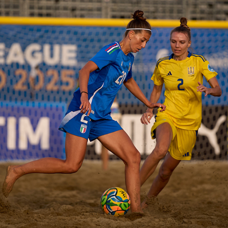 © beachsoccer.comPARTITA. Dopo un’iniziale fase di studio, le Azzurre ci provano con Vecchione, che impegna Terekh dalla distanza al 05′ 11″. Trascorrono un paio di minuti e la numero 7 della formazione di Simone Feudi ci riprova, ancora con il destro, che stavolta termina alto. L’Italia continua ad attaccare e, a pochi secondi dalla prima sirena, si rende pericolosa con Veglio, il cui destro è respinto dall’estremo difensore ucraino.