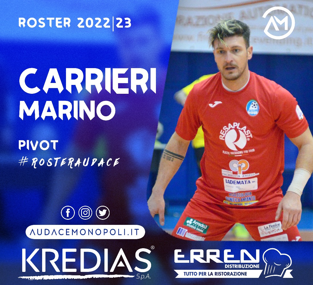 E’ Marino Carrieri il nuovo pivot della Kredias Audace Monopoli, il primo colpo dopo l’ufficialità della Serie B. Classe ’89, il giocatore nativo di Polignano arriva dal Castellana C5, dove ha disputato le sue due ultime stagioni tra C1 e B, e in precedenza vanta anche diverse presenze nel campionato di Serie A2 a Rutigliano, dove è andato a doppia cifra per gol stagionali.