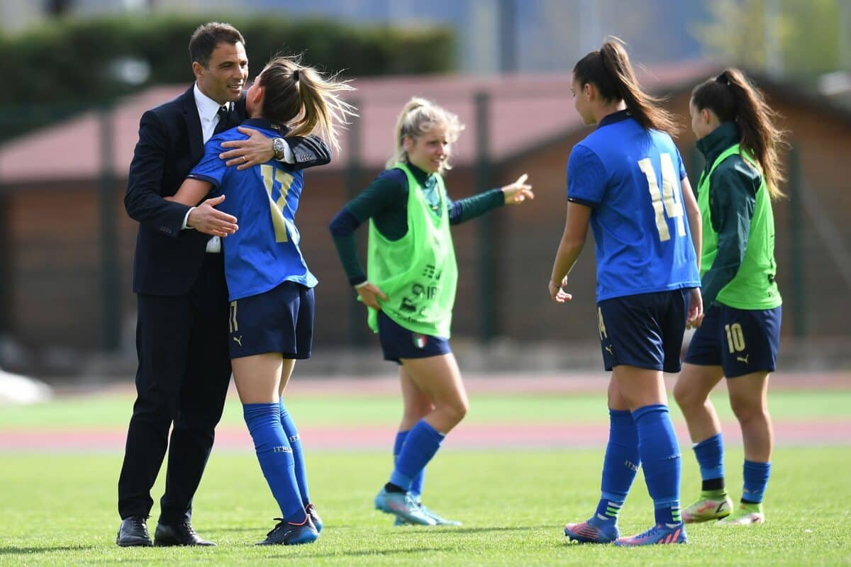 PADOVA, ITALY – APRIL 09: Enrico Sbardella head coach of Italy women U19 embraces Alice Ilaria Berti of Italy women U19 during the Elite EURO Women’s Under 19 match between Italy and Hungary on April 09, 2022 in Padova, Italy. (Photo by Alessandro Sabattini/Getty Images)
