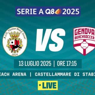 Beach Soccer 13 Luglio 2025 di Redazione · Published 13 Luglio 2025 Beach Soccer 2025, Serie A Q8 I VASTESE BS – GENOVA BS | Poule Promozione