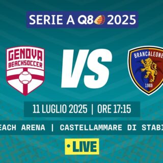 Beach Soccer 11 Luglio 2025 di Redazione · Published 11 Luglio 2025 LIVE!!! Beach Soccer 2025, Serie A Q8 I GENOVA BS VS BRANCALEONE BS Poule Promozione