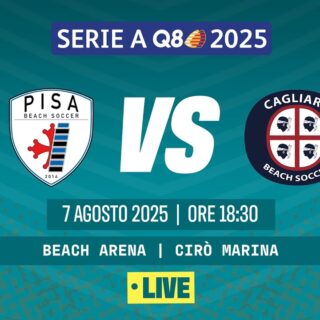 Beach Soccer 7 Agosto 2025 di Redazione · Published 7 Agosto 2025 Beach Soccer 2025, Serie A Q8 Poule Scudetto: LENERGY PISA BS – CAGLIARI BS / NAPOLI BS BS – WE BEACH CATANIA / TERRACINA BSC VS ROMA BS