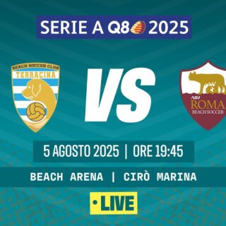 Beach Soccer 5 Agosto 2025 di Redazione · Published 5 Agosto 2025 LIVE!!! Beach Soccer 2025, Serie A Q8 I TERRACINA BSC VS ROMA BS | Poule Promozione