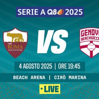 Beach Soccer 4 Agosto 2025 di Redazione · Published 4 Agosto 2025 LIVE!!! Beach Soccer 2025, Serie A Q8 I ROMA BS – GENOVA BS Poule Promozione