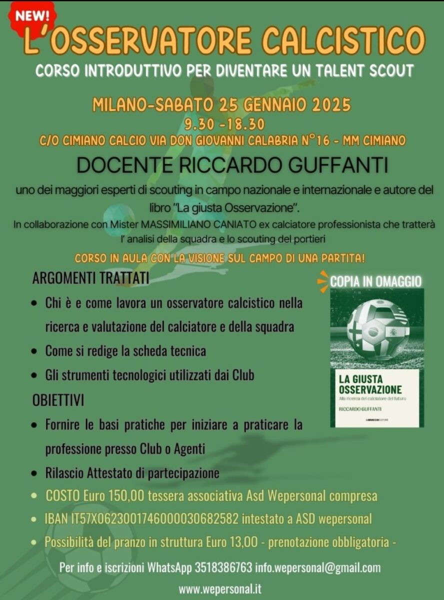 Corso Introduttivo per diventare un Osservatore Calcistico. Docente Riccardo Guffanti e Massimiliano Caniato
