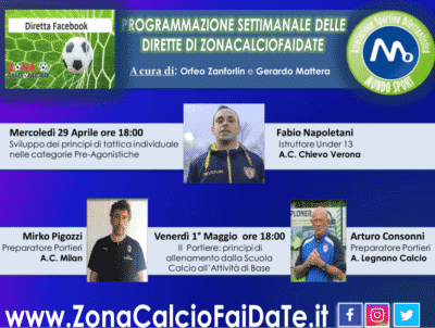Le Dirette della settimana su FB ZonacalciofaidateNews e www.zonacalciofaidate.it “Sviluppo dei principi di tattica individuale nelle categorie Pre-Agonistiche” “Il Portiere, principi di allenamento dalla Scuola Calcio all’Attività di Base”