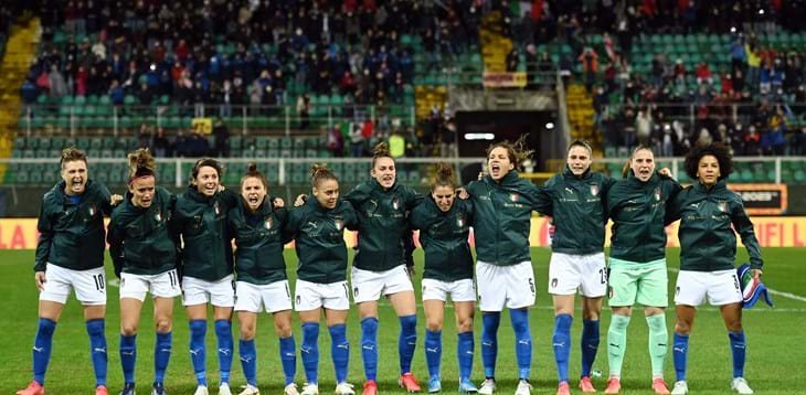 PALERMO, ITALY – NOVEMBER 26: Players of Italy sing the National Anthem prior to the FIFA Women’s World Cup 2023 Qualifier group G match between Italy and Switzerland at on November 26, 2021 in Palermo , Italy. (Photo by Tullio M. Puglia/Getty Images)