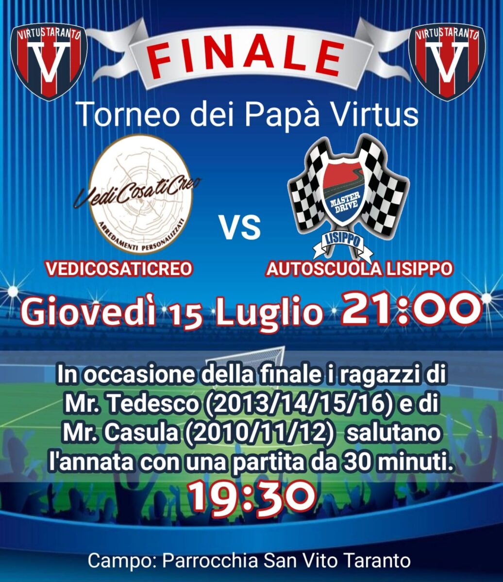 Giovedì 15 Luglio a partire dalle ore 21 presso gli impianti di San Vito, si disputerà il match finale del Torneo dei Papà organizzato dalla Virtus Taranto di Fabio Buonafede, che vedrà di fronte le squadre di Autoscuola Lisippo e Vedicosaticreo. A partire dalle ore 19,30 in virtù del match finale del torneo, ci sarà un match di 30 minuti tra le formazioni allenate da Mister Tedesco (2013/14/15/16) e mister Casula (2010/11/12), per salutare l’annata. Il torneo dei genitori è risultata una bellissima iniziativa, con entusiasmo alle stelle anche da parte dei bambini.