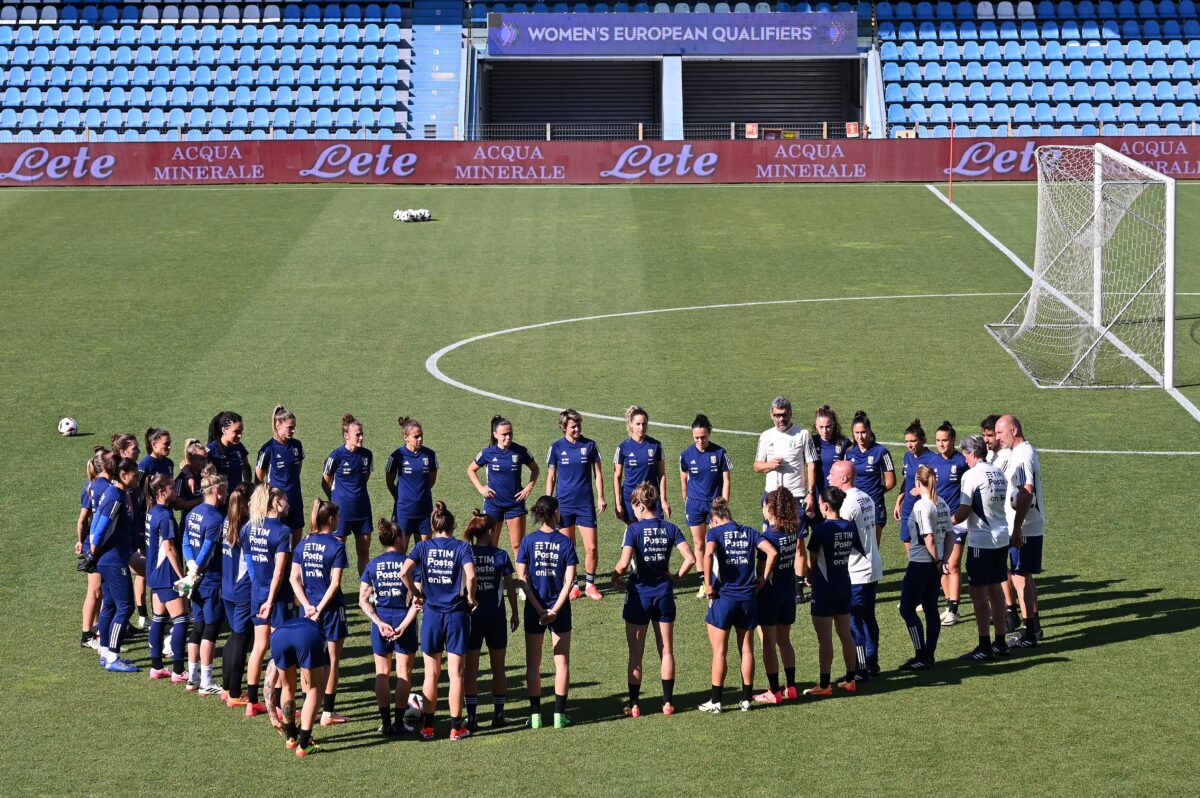 FERRARA, ITALY – JUNE 03:Italian players warm up during the Italy Women Press Conference & Walk Around at Stadio Paolo Mazza on June 03, 2024 in Ferrara, Italy. (Photo by Alessandro Sabattini/Getty Images)
