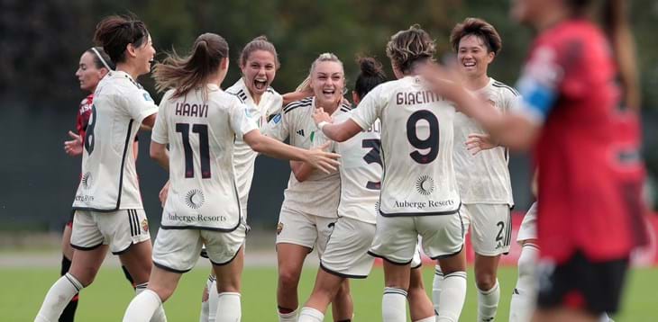 Il primo big match di stagione, tra Milan e Roma, va alle campionesse d’Italia in carica: sul campo delle rossonere, una sfida molto combattuta si chiude 4-2 per le capitoline, che mettono a segno i primi tre punti nel campionato 23/24. Le giallorosse di Spugna partono molto aggressive e dopo una serie di calci piazzati non sfruttati, sbloccano il punteggio sugli sviluppi di una punizione dalla trequarti: traiettoria di Giugliano, spizzata di testa di Bartoli e deviazione vincente di Linari, che porta avanti le ospiti. Le rossonere accusano il colpo e dopo soli tre minuti incassano il 2-0: erroraccio di Arnadottir nei pressi della propria area, Haavi le strappa il pallone e con un destro potente batte Giuliani tra i pali. Al rientro in campo è il Diavolo a fare la partita e l’insistenza della manovra offensiva del gruppo di Ganz viene premiata prima al 50’ – destro velenoso di Dompig pescata bene dall’ex giallorossa Swaby – e poi al 61’, con il primo sigillo in rossonero di Marinelli, arrivata in estate dall’Inter. L’attaccante classe ’98, appena entrata in campo al posto di Grimshaw, trova una zampata vincente in mezzo a una mischia nell’area capitolina e in un minuto pareggia il conto. Dopo la rete del 2-2 Spugna manda in campo Greggi e Glionna, venendo ripagato con due gol pesantissimi. Il primo, al 79’, è una vera prodezza della centrocampista classe 2000, che supera Giuliani con un destro a giro perfetto. Il secondo, in pieno recupero, lo mette a referto Glionna, che finalizza sotto porta il suggerimento di Serturini. Poker della Roma all’esordio stagionale in Serie A, che inaugura il campionato 23/24 aggiudicandosi un importante scontro diretto.