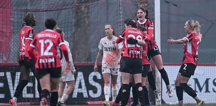 MILAN-ROMA 3-2. Al Puma House of Football è tripudio rossonero e festa amara per la Roma, giunta oggi alla sua 150ª partita in Serie A ma anche alla seconda sconfitta nelle ultime tre giornate. Tanti ko quanti quelli maturati nelle precedenti 26 partite del torneo (19 vittorie, sei pari). L’avvio delle campionesse d’Italia in carica è così arrembante che, per la prima occasione da gol, bisogna attendere solo 5’. Di Guglielmo sfonda in area da sinistra e calcia forte da ottima posizione, non inquadrando però lo specchio. Grazie a una buona attenzione difensiva, la formazione padrona di casa concede soltanto conclusioni dal limite alle avversarie. Alcune oltrepassano i pali o sorvolano la traversa, ma una è semplicemente stupenda e vale l’1-0 romanista. A firmarla è Greggi al 32’, con una perla di mancino all’incrocio dei pali. Il Milan non risente però affatto dello svantaggio e, quattro minuti più tardi, trova il gol del pari. Soffia ricama in area di tacco per Arrigoni, la quale fulmina Ceasar sul primo palo con un sinistro rasoterra che vale l’1-1. Per Arrigoni si tratta del terzo gol nelle ultime sei presenze in campionato: tra le calciatrici con almeno tre reti in questo torneo, solo Eva Schatzer (Juventus) è più giovane rispetto alla rossonera. Due giri di lancette e la Roma torna avanti. Gran lavoro di Viens nel giocare in area spalle alla porta, sfera allargata a destra dove Corelli incrocia benissimo, battendo Giuliani per il 2-1 giallorosso. In chiusura di primo tempo, tocca poi alla stessa Viens sfiorare il tris: bell’iniziativa personale e destro secco rasoterra, su cui il numero uno rossonero risponde però presente con reattività.