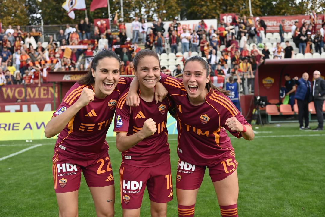 ROMA-INTER 3-0. La Roma non sbaglia neanche con l’Inter e si conferma a pieno titolo la legittima proprietaria della testa della classifica, con quattro vittorie nelle prime quattro. Nella sfida del Tre Fontane, bastano 3 minuti e 24 secondi alle padrone di casa per portarsi avanti nel punteggio: cross di Kühl e diagonale vincente dell’ex nerazzurra Pandini, che sigla la sua terza marcatura stagionale tra tutte le competizioni (le stesse totalizzate nella scorsa annata, in 25 match). Le giallorosse sfiorano il raddoppio sempre con Pandini al 26’, mentre tra le nerazzurre sono Magull e l’ex Roma Glionna le più pericolose (traversa al 50’ per la classe ‘99). Tuttavia, il punteggio cambia a favore delle capitoline al minuto 67’, con un’altra ex della gara: è infatti la subentrata Dragoni a segnare il 2-0 per le undici di Rossettini, lanciata in contropiede da Viens. La squadra di Piovani fatica a trovare gli spazi e nel finale, dopo un’altra occasione per Glionna respinta da Baldi, incassa il tris di Giugliano, che mette il punto esclamativo sullo scontro diretto tra giallorosse e nerazzurre, con il Biscione a -7 dal primo posto.