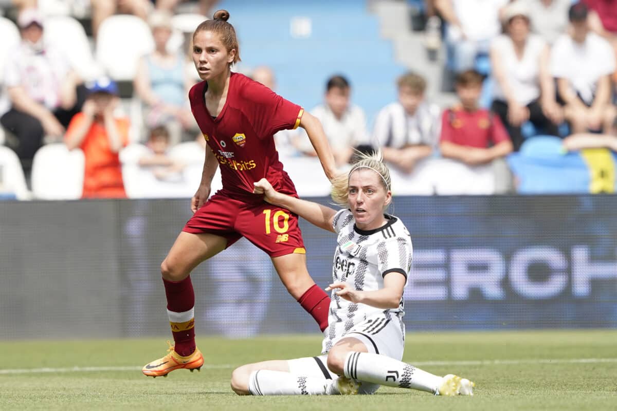 FERRARA, ITALY – MAY 22: Manuela Giugliano of AS Roma Women compete for the ball with Linda Birgitta Sembrant of Juventus Women during the Women Coppa Italia Final between Juventus and AS Roma at Stadio Paolo Mazza on May 22, 2022 in Ferrara, Italy. (Photo by Danilo Di Giovanni/Getty Images)