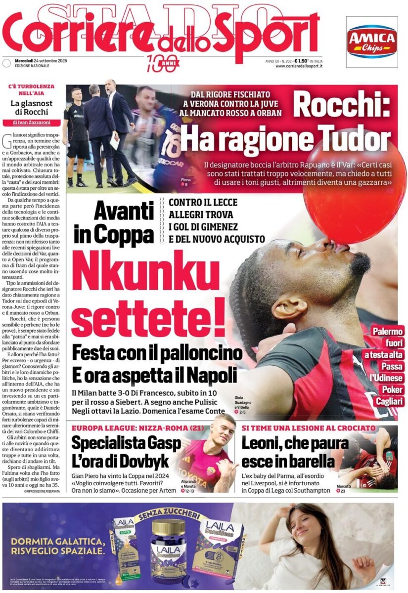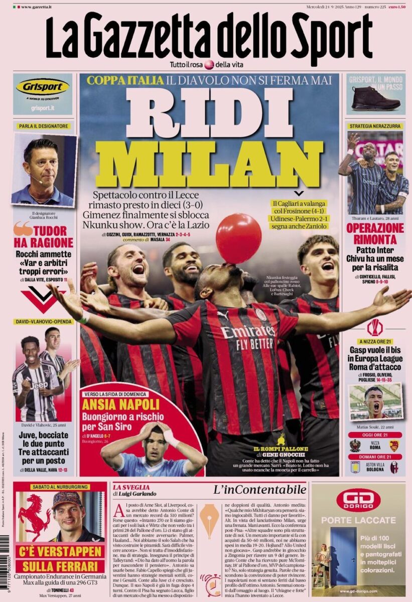 Le Prime Pagine dei Quotidiani Sportivi di Mercoledi 24 Settembre di Redazione · 24 Settembre 2025 Share