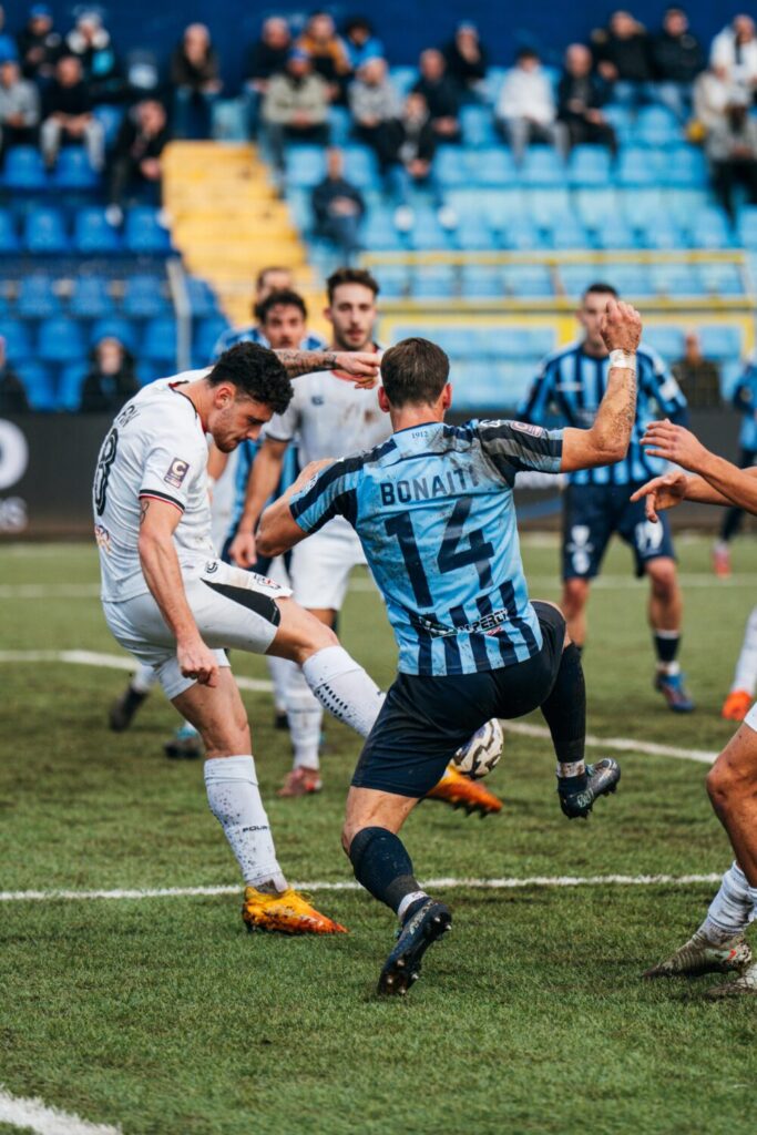 Il primo tempo del match è particolarmente spezzettato e con pochissima continuità di gioco. I primi squilli sono blucelesti, con un tentativo ravvicinato di Duca ribattuto da Piran e un tiro di Pellegrino bloccato da Livieri. Dall’altra parte Comi impegna Furlan in diagonale, preludio al vantaggio ospite che matura alla mezz’ora con un destro potente di Sow sulla torre di Marchetti. Il raddoppio arriva nel maxi-recupero del primo tempo (8 minuti) con una conclusione di Comi da dentro l’area che si insacca sotto la traversa. Metlika prova la risposta immediata impegnando Livieri dalla distanza.