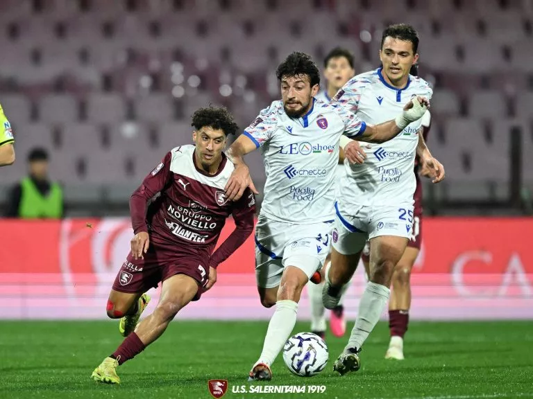 All’Arechi la Salernitana supera il Casarano e torna al successo. Al 10’ vantaggio granata: cross di Achik e colpo di testa vincente di Molina. Al 28’ doppia occasione clamorosa per gli ospiti: cross di Ferrara per Santarcangelo che di testa colpisce il palo, subito dopo altro colpo di testa ravvicinato di Leonetti e palla che sbatte sulla traversa. Al 37’ granata pericolosi con una bella conclusione di Molina respinta in angolo. Al 40’ insiste la Salernitana: cross di Villa e girata al volo di Molina bloccata in due tempi da Bacchin. Il primo tempo si chiude con i granata avanti nel punteggio. Al 3’ della ripresa grande ripartenza della Salernitana con Achik che serve Villa, l’esterno granata fa partire una conclusione deviata sulla traversa. Al 23’ raddoppio granata: pressione di Achik su Bacchin che sbaglia il rinvio, ne approfitta Lescano che a porta vuota deposita la palla in rete. Al 25’ tris Salernitana: recupero di Lescano in pressing sul difendente, palla filtrante di Achik per Longobardi e assist perfetto per Lescano che mira l’angolo lontano e realizza la doppietta personale. Al 41’ tentativo a giro di Achik, palla alta. Al 42’ ospiti pericolosi con la conclusione di Cerbone che colpisce la traversa. Finisce 3-0 per i granata.