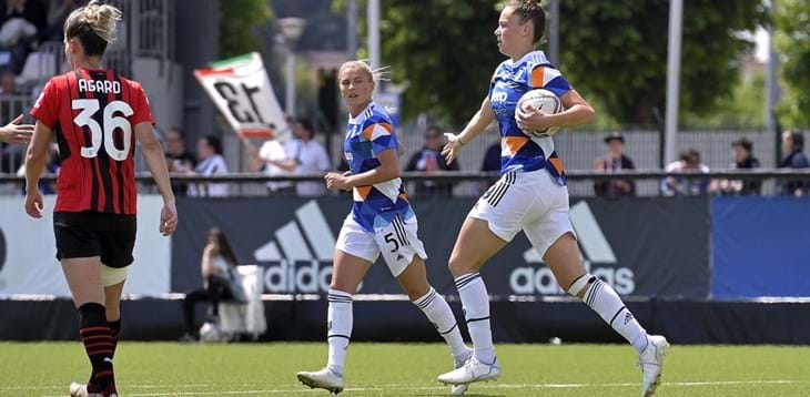 La Juventus soffre e va sotto con il Milan, ma nel finale rimonta e si aggiudica la sesta finale in cinque stagioni, la seconda in Coppa Italia dopo quella contro la Fiorentina dell’aprile 2019. Nella semifinale di ritorno della competizione 21/22, il Diavolo – sconfitto con un pesante 6-1 in casa nei primi 90’ – sblocca il punteggio dopo appena nove minuti: Adami serve a perfezione Thomas sul filo del fuorigioco, la francese si invola verso la porta bianconera e con un elegante pallonetto supera Aprile. Poco dopo l’1-0 proprio Adami ha la chance di raddoppiare ma la centrocampista rossonera, in mezzo a una mischia in area avversaria, non riesce a inquadrare la porta con il sinistro. Con il trascorrere dei minuti i ritmi si abbassano e a fine primo tempo il parziale non cambia. La squadra di Ganz rientra in campo più convinta e al 49’ Bergamaschi punisce la difesa bianconera, sfruttando la verticalizzazione di Piemonte. Il 2-0 per le lombarde scuote la Vecchia Signora, che alza il ritmo e al 51’ accorcia con la rete di Staskova, rapida a spingere il pallone in porta dopo la respinta di Babb su Caruso. Nonostante il gol della ceca le undici di Ganz non si disuniscono e al 57’ calano il tris con Bergamaschi, autrice della sua seconda doppietta in rossonero dopo quella dello scorso 24 aprile in campionato contro il Pomigliano. 3-1 per le milanesi ma Caruso e compagne non ci stanno e al 68’ il secondo sigillo di Staskova, arrivato sugli sviluppi di un calcio di punizione, dà il via alla rimonta, completata da una prodezza da fuori area di Bonansea dieci minuti più tardi, dal gol di Caruso su calcio di rigore (punita con il penalty e con l’espulsione per somma di ammonizioni l’entrata scomposta di Tucceri su Bonfantini nella propria area) e da Boattin all’87’, che non sbaglia davanti alla porta dopo un primo intervento di Babb. Termina 5-3 per la Juventus la semifinale di ritorno di Coppa Italia Socios.com contro il Milan, un successo che permetterà alle undici di Montemurro di giocarsi il trofeo contro la Roma detentrice del titolo. L’appuntamento per l’ultimo atto è fissato al 22 maggio al “Paolo Mazza” di Ferrara.