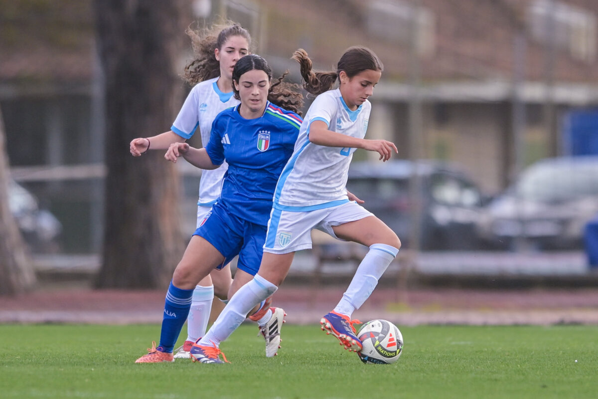 Sulla strada per il Torneo di Sviluppo in programma a maggio, la Nazionale femminile Under 16 si è recata a Tirrenia per l’ormai canonica amichevole con la Selezione Calcio +15 dell’Italia. Tre tempi di gioco pieni di indicazioni utili per il CT Luca Righi, che ha potuto vedere all’opera, in un contesto a tutti gli effetti internazionale, le diciannove ragazze convocate, molte delle quali al di sotto dell’età media delle avversarie azzurre. È purtroppo durata solamente 21’ la partita di Alice Cecchetti, seriamente infortunatasi al polso durante il primo tempo e costretta per questo a lasciare il campo. Nel complesso, le Azzurrine hanno messo in mostra una certa differenza di esperienza, ritmo e struttura – come facilmente preventivabile, dato l’ampio bacino cui possono attingere le Nazionali italiane – ed infatti si sono imposte in tutte e tre le frazioni, senza concedere gol ma segnandone progressivamente meno all’avvicinarsi triplice fischio, a testimonianza di quanto crescente sia stata, nonostante le oggettive difficoltà, la tenuta delle giovanissime Titane sulla lunga distanza. Anche questo dato è finito sul taccuino del Commissario Tecnico sammarinese, complessivamente soddisfatto dell’esperienza pisana: “Dal punto di vista della filosofia, il nostro obiettivo è utilizzare queste esperienze per capire dove dobbiamo migliorare. Confrontarci con realtà di alto livello ci offre indicazioni precise su quali aspetti tecnici, tattici e mentali dobbiamo migliorare e ci aiuta a capire come orientare il lavoro nei prossimi mesi. È un passaggio duro, ma fa parte di un percorso di crescita. Se guardiamo alle tre frazioni di gioco, il passivo è stato progressivamente meno ampio. Questo non cambia il risultato finale (19-0, ndr), ma racconta di una squadra che ha provato a riordinarsi, a restare dentro la partita e a non smettere di competere nonostante le difficoltà. Anche chi è entrata a partita in corso ha dato il proprio contributo, mettendoci l’atteggiamento giusto e non tirandosi mai indietro. Questo è ciò che mi rende particolarmente contento in una partita che si poteva presumere essere molto complicata su un piano fisico e tecnico. “