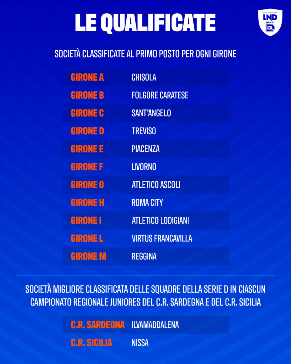 » Zonacalciofaidate » LIVE Le partite » Juniores Nazionali Under 19 » Juniores Nazionali le società qualificate alla fase finale