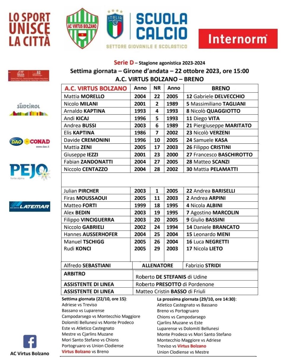 LIVE!!! VIRTUS BOLZANO – BRENO 7° giornata Serie D – Girone C